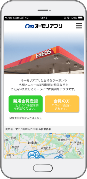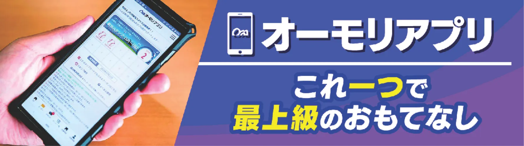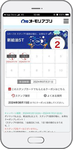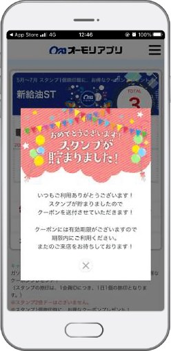 当社の公式アプリ「オーモリアプリ」は給油をするたびにスタンプを捺印、スタンプを押す毎にお得なプレゼントクーポンがもらえる、押して楽しいもらえて嬉しいお得なアプリです。