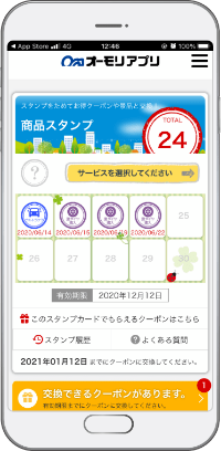 アプリを開いた最初の画面の「商品スタンプ」を押すと切り替えることができます。